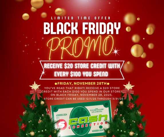 Friday, November 28th only – spend $100 get a $20 store credit to use on a future visit. Store credit can be used from 12/1/2025 through 3/31/2025. Don’t miss your opportunity to earn some Cash Connection Bucks!